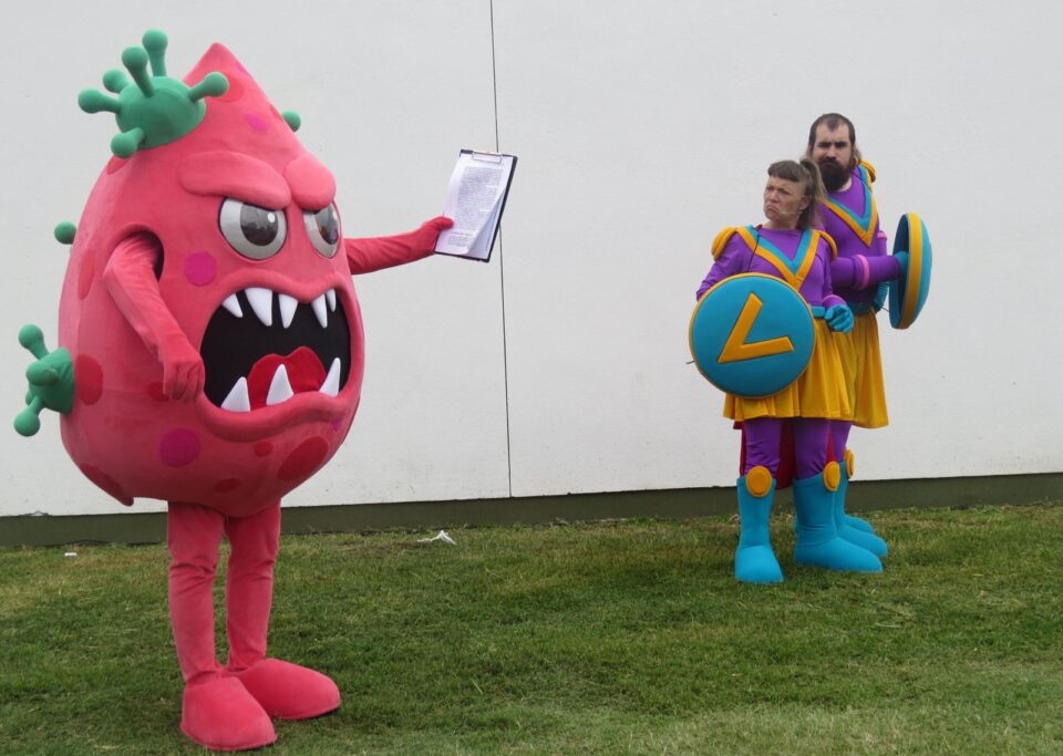 Previamente, participaron de una intervención artística que retoma el universo narrativo de Vax Team: una historia en la que los virus y bacterias son los villanos, y los chicos y chicas, al vacunarse, se transforman en superhéroes que se suman a un equipo para proteger a la comunidad. Esta puesta, desarrollada por el Ministerio de Cultura, se integra a los contenidos digitales previstos, que amplían esta narrativa en distintos formatos.